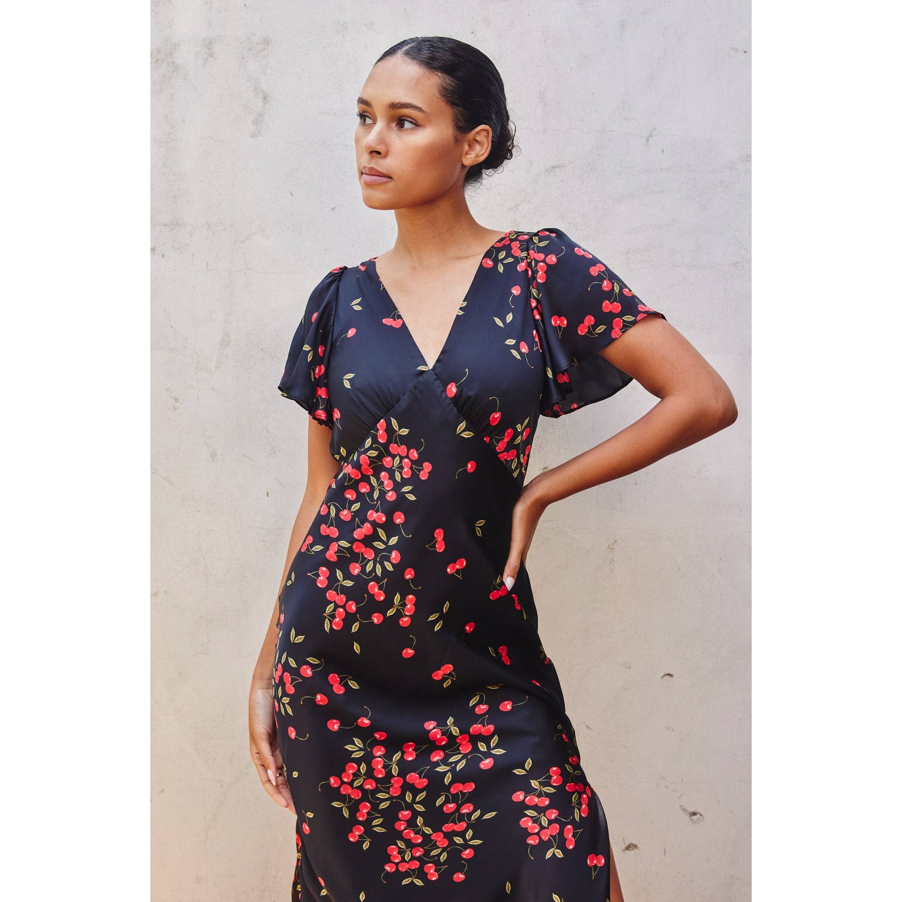 Cherry print maxi dress. Short flutter sleeves - Plunging neckline - Left side slit on the flowy skirt - Hidden back zipper closure - Lined except the sleeves.